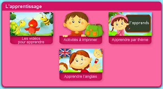 - La rubrique APPRENTISSAGE : dans cette partie, l’enfant trouvera des vidéos ludoéducatives pour apprendre les chiffres, l’ alphabet , les tables de multiplication , les couleurs, les animaux, …etc, et beaucoup d’autres choses, le tout en français et en anglais.